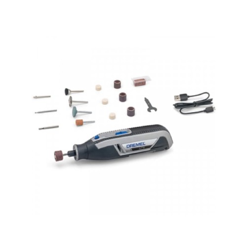 | Karakteristike | Tehničke karakteristike: Broj obrtaja u praznom hodu: 8.000 – 25.000 o/min Vreme punjenja akumulatora: 2,5 h Napon akumulatora: 3,6 V Kapacitet akumulatora: 2,0 Ah Prihvat: EZ-Twist Pribor u obimu isporuke: Dremel Sekač velike brzine 3,2 mm (194) - 1 kom Dremel Dijamantski okrugli vrh 2 mm (7103) - 1 kom Dremel Kamen za brušenje od aluminijum oksida 9,5 mm (932) - 1 kom Dremel Kamen za brušenje od silicijum karbida 19,8 mm (85422) - 1 kom Dremel Četka od ugljeničnog čelika od 19 mm (428) - 1 kom Dremel Četka 13,0 mm (404) - 1 kom Dremel Točak za poliranje od 13 mm (414) - 3 kom Dremel Smeša za poliranje (421) - 1 kom Dremel Osovina (401) - 1 kom Dremel traka i osovina za brušenje od 13 mm, krupnoća 60 (407) - 1 kom Dremel Traka za brušenje od 13 mm, krupnoća 60 (408) - 2 kom Dremel Traka za brušenje od 13mm, krupnoća 120 (432) - 1 kom |