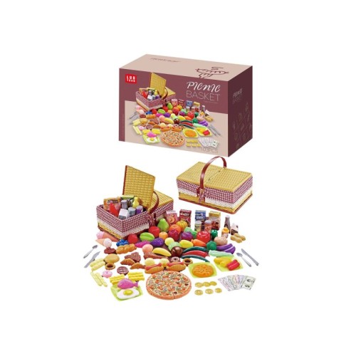 U kompletu:1 korpa za piknik,103 dodatka: konzerve, kečap, voće i povrće, slatkiši, hot dog, pica, biftek i pileći batak, pomfrit, posuđe i pribor, novac itd. Materijal: kvalitetna plastika.