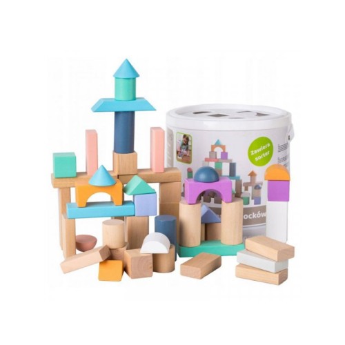 Komplet sadrži 50 komada drvenih kockica za decu zajedno sa šarenom kantom i sorterom oblika.