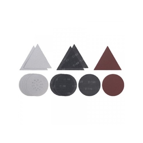 | Karakteristike | Obim isporuke: 5 x različitih trouglastih brusnih papira i rešetki granulacije G80 8 x okrugli abrazivi granulacije G80 2 x okrugli brusni papiri sa granulacijom G120 |
