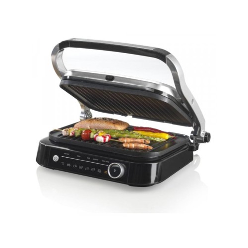| Karakteristike | Boja: Siva Karakteristike: Hladne ručke Premaz protiv lepljenja namirnica Podesiva visina Radna pozicija Otvoreno - zatvoreno Jednostavno pečenje Oprema: Rebrasta ploča za roštilj Jednostrana ploča sa premazom Konvencionalni grejač Gradientna odvodna rupa i ležište za ulje Posuda za tečnost Prostor za smeštanje priključnog kabla za jednostavno smeštanje Gumirane nogice za stabilnost Masa: 5.2 kg Dimenzije: ŠxVxD: 380 x 180 x 320 mm |