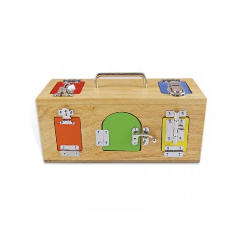 Drvena kutija sa različitim vrstama brava i katanaca koja pomaže deci da nauče pravilno otključavanje i zaključavanje istih.