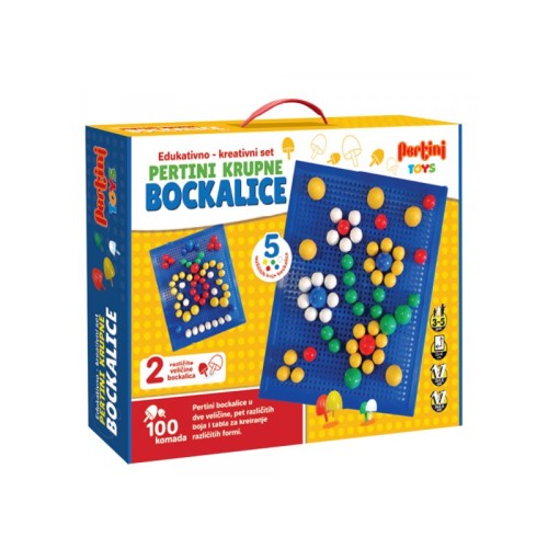 Karakteristike Set sadrži 100 komada bockalica u dve veličine i pet različitih boja, kao i tablu za kreiranje različitih formi i oblika. Dimenzije table su 22x18cm. Svi elementi su proizvedeni od netoksičnih materijala voskog kvaliteta.