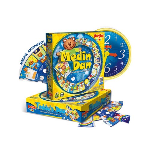 Na kutiji se nalazi QR kod, čijim skeniranjem deca mogu da poslušaju audio priču o Medinom danu, a zatim da, vođeni pričom, slože slagalicu i prate Medine aktivnosti od jutra do večeri. Igra sadrži: 24 ilustrovana dela slagalice, sat sa kazaljkama.