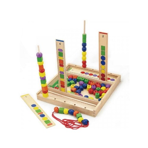 Set sadrži kutiju/bazu na koju se postavlja 5 panela sa zadatim obrascima za ređanje perlica vertikalno na postavljene štapove, prepoznavajući perle po obliku i boji.