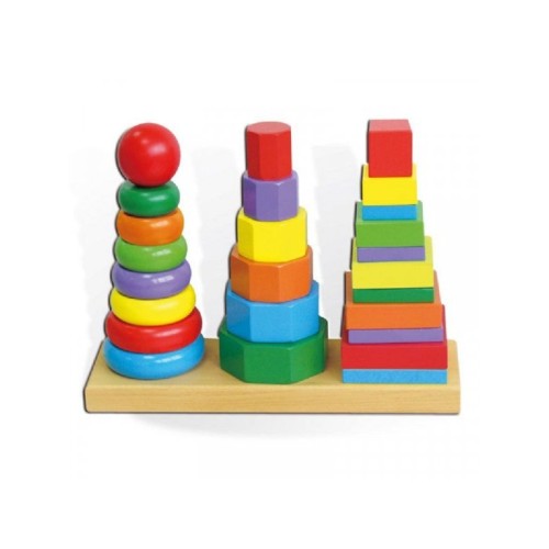 drvenu bazu sa 3 štapa, 8 kružnih, 6 nepravilnih i 10 kockastih oblika,međusobno različitih boja i veličina.