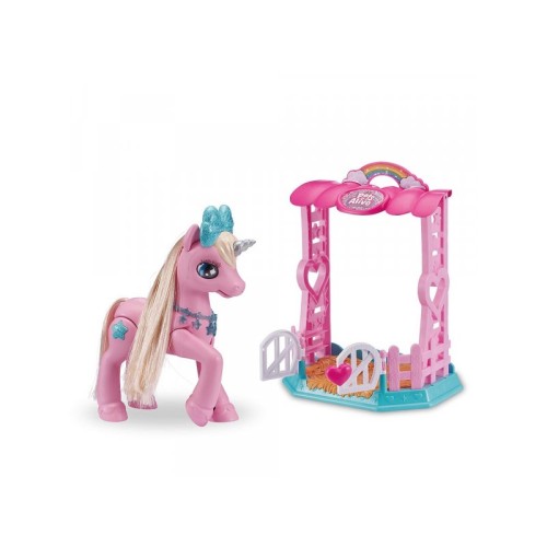 | Karakteristike | Set sadrži jednoroga sa podesivom plavom ogrlicom, šararepu kojom možete hraniti svoj ljubimca i roze štalu sa vratancima koja se otvaraju. Istražite 20 načina za interaktivnu igru sa jednorogom. Poseduje zvučne efekte poput ponavljanja onoga što izgovorite, imitacije konja dok spava, pevanja pesmice, slanja poljupca i još mnogo toga! Set podstiče decu da igraju igru uloga, njihovu empatiju I maštu. Dimenzije: 23 x 16.5 x 31.5cm, |