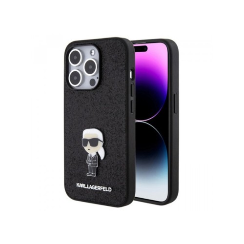KARL LAGERFELD Maska za iPhone 15 Pro IKONIK FIXED GLITTER IKONIK LOGO METAL PIN BLACK
