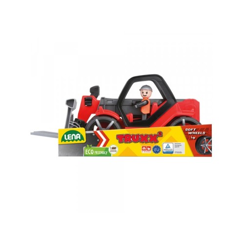 | Karakteristike | Teleskopski utovarivač LENA TRUXX sa gumom na točkovima, osovinama od pocinkovanog čelika 4 mm, kabinom vozača , 2-stepenom podiznom rukom koja se može produžiti do 34 cm, viljuškom koja se može zakačiti na ručku, kukom za prikolicu i LENA igračkom. Dužina: 35 cm. Pogodno za unutrašnju i spoljašnju upotrebu. |
