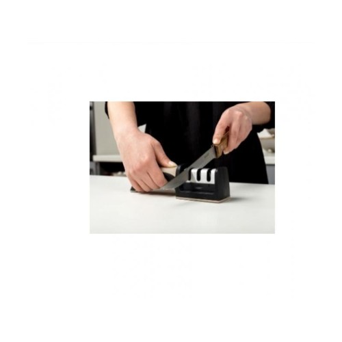 | Karakteristike | Težina : 0,16kg Dimenzije : dužina : 21,5cm , visina 6,5cm , širina 5cm Trostepeni sistem : Prvi služi za oštrenje i obnavljanje ivice , drugi precizno zaglađuje, a treći za fino poliranje . Materijal : telo-visokokvalittena plastika , oštrači - kombinacija čelika I keramike . Glava brusilice se može ukloniti tadi lakšeg čišćenja . Nije pogodan za keramičke noževe . Nekoliko puta provučete nož kroz proreze oštrica i postaje kao nov. Koristitie kuhinjske rukavice radi dodatne mere opreza . Držite oštrač na ravnoj površini . |