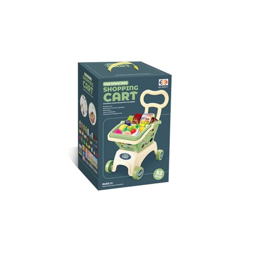 Dečija kolica za kupovinu modernog dizajna sa pratećim elementima. Set sadrži 52 elementa:Korpu za kupovinu, kutiju za užinu, voće, povrće, POS mašinu, novčanice,kreditne kartice i kartice za kupovinu.