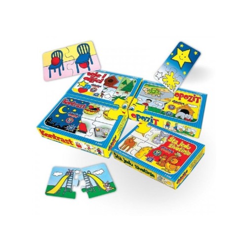 | Karakteristike | Pomaže deci da upoznaju međusobno iste ili suprotne pojmove. Po sistemu spajanja parova, klasifikacijom, sistematizacijom, eliminacijom i logičkim zaključivanjem, u igri se stiču nova iskustva i znanja. Komplet se može koristiti i u igrama asocijacije i memorije. |