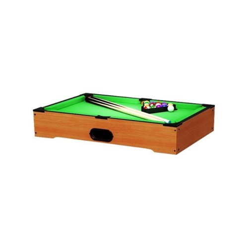 | Karakteristike | Stoni bilijar izraden od kvalitetnog drveta. Komplet sadrži dva drvena bilijarska štapa, bilijar kugle, četku za održavanje zelene podloge po kojoj se igra, graničnik za kugle. Stabilan i praktičan omogućava igru za veći broj učesnika. Dimenzije: 52x30.5x7.7cm |
