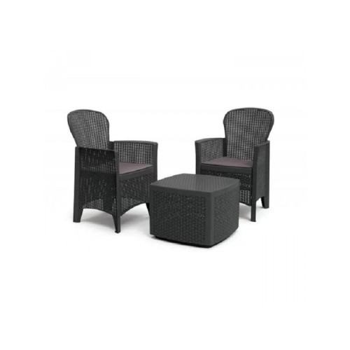 | Karakteristike | Set čine: 2 fotelje, sto Set sa jastucima Materijal: plastika Boja jastuka: Siva Dimenzija fotelje: 59x57x85,5cm Dimenzija stola: 53x53x40cm Težina: 15 kg |