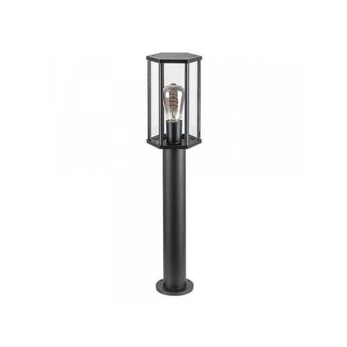 • Mat crna lampa koja je napravljena od aluminijuma dopunjena je šestougaonim providnim staklenim abažurom i robusnim telom koje se završava postoljem u obliku diska.