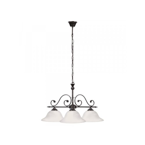| Karakteristike | Materijal: Metal/Staklo Karakteristike: IP zaštita: IP20 Broj grla: 3 Vrsta grla: E27 Specifikacije osvetljenja: E27 3 x MAX 60 W Primenjena voltaža: 230 V, 50 Hz Boja: Crna Dimenzije: Udaljenost od stropa: 90 cm Širina abažura: 64 cm Masa: 3.55 kg Pakovanje: Dimenzije pakovanja: 40 x 40 x 40.8 cm Bruto masa: 5.3 kg |