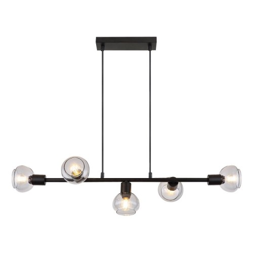 | Karakteristike | Tip: Visilica Stil lampe: Moderna Preporučena prostorija za korišćenje: Dnevna soba, spavaća soba, trpezarija IP zaštita: IP20 Boja lampe: Crna Materijal lampe: Metal Boja abažura: Boja dima Materijal abažura: Staklo Broj grla: 5 Vrsta grla: E14 Specifikacije osvetljenja: E14 5x max 40W Primenjena voltaža: 230V, 50Hz Rastojanje od plafona: 1200 mm Dimenzije: 830 x 250 mm |