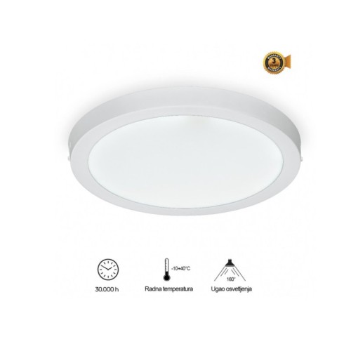 | Specifikacija | Nazivni napon: 85-265 V AC Nazivna snaga: 36 W Temperatura boje svetlosti: 4000 K Boja artikla: Bela Materijal: Aluminijum/PS Dimenzije: Ø 400 mm, h - 40 mm Ugao rasipanja svetlosti: 160° Prosečan radni vek: 30 000 h na 25° C Potrošnja elek. energije: 36 Kwh / 1000h |