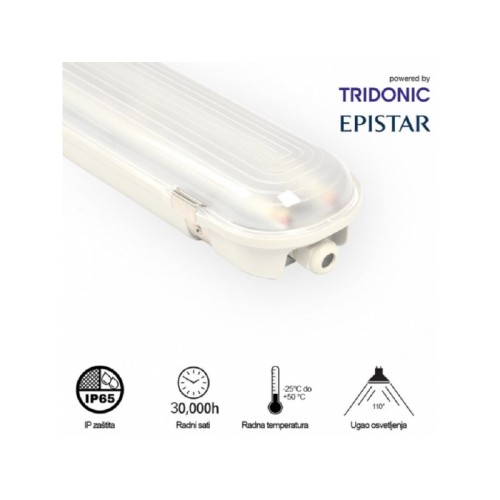 | Karakteristike | Nazivni Napon: 220-240 V AC Nazivna Snaga: 76 W Temperatura Boje Svetlosti: 6500 K Boja Svetla: CW ( hladno bela ) Svetlosni Fluks: 10260 lm Izvor Svetlosti: LED SMD 2835 Epistar Trafo (Drajver): TRIDONIC Dimabilnost: Ne Boja Artikla: Siva Materijal: PC Dimenzije: 1540 x 107 x 76 mm Način / Tip Montaže: nadgradna Ugao Rasipanja Svetlosti: 110° Indeks Reprodukcije Boje (CRI): ≥80(Ra) Faktor Snage (Pf): veće od 0.9 Temperatura Okruženja (ºC): -25 °C do +50 °C Prosečan Radni Vek: 35 000 h na 25° C Broj Uključenja / Isključenja: 15 000 Energetska Efikasnost: A+ Stepen Električne Zaštite: Klasa I IP Zaštita: IP 65 Transportno Pakovanje: 6 kom |