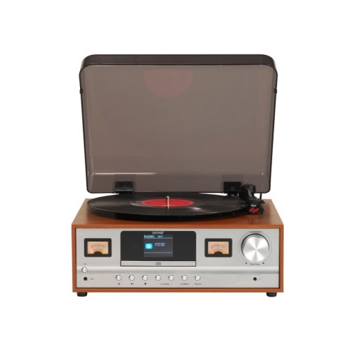 | Karakteristike | Bluetooth: Da Brzine: 33 1/3, 45, 78 o/min Vrsta pogona: Direct drive Snaga: 2x5W Priključci: AUX ulaz Ulaz za slušalice Opšte karakteristike: Chipset: SPREAD SP10SP80 DAB+/FM Radio 2 x VU meter CD plejer 2.4" displej u boji Daljinski upravljač 2 x drvena zvučnika Potrošnja: 18 W Masa: 6.1 kg |