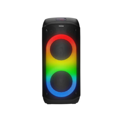 | Ostale karakteristike | Mikrofon: 2 bežična VHF mikrofona Podrška za karaoke: Da – moguće je pričati preko mikrofona dok svira muzika Bluetooth domet: Približno 10 metara Kontrola: Ručna kontrola sa gornjeg panela + daljinski upravljač |