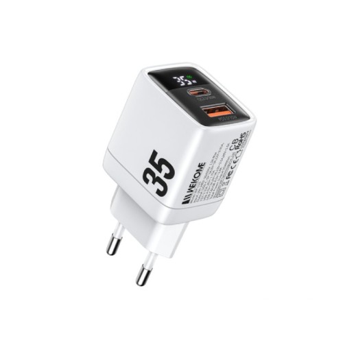 WEKOME WP-U25 Super brzi Strujni GaN Punjač, 2-porta USB (3.0 i 3.1 Tip-C) 35W, sa displejom, beli